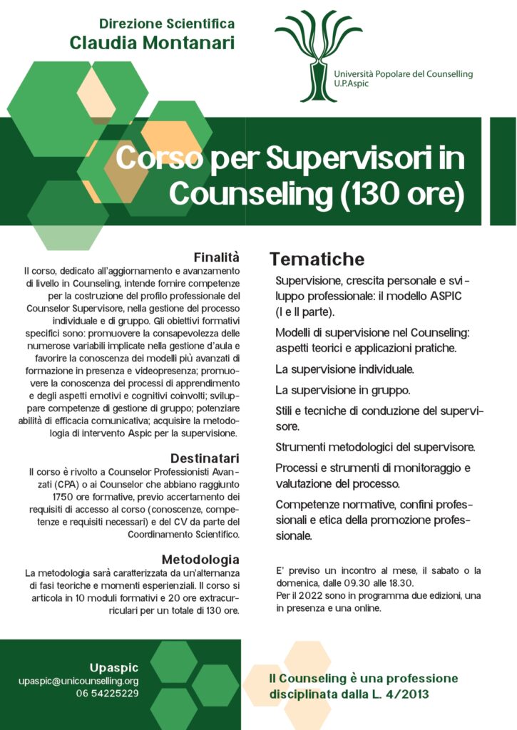 Rivolto a tutti i Counselor Professionisti Avanzati e ai Counselor Formatori che intendono acquisire un nuovo livello di competenze, vi informiamo che è finalmente attivato il corso ASPIC per Supervisori in Counseling.